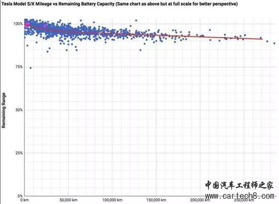 特斯拉论坛内的一群车主正从全球350多辆特斯拉汽车处采集相关的数据,并将其研究发现频繁更新到谷歌的公共文件内。该数据清楚地表明,在经历了5万英里(约10万公里)行驶里程后,大多数特斯拉车载蓄电池容量的衰减率将达到5%,随着行驶里程数的增长,电池的容量将趋于平稳状态,看起来似乎不太会再衰减5%。