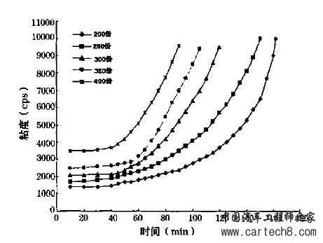 填料添加量对粘度的影响,以氧化铝填料为例,添加量对浇注体系粘度的影响,在80℃下随时间的变化情况。可以看出随着氧化铝填料用量增多,浇注体系的起始粘度不断增大,同时在80℃下从起始粘度升致10000cps时填料420份比200份所需的时间要短。这不利于灌封材料的工艺性。