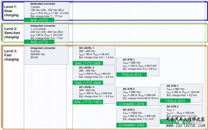 国际电工委员会(IEC)也有类似的分类。CHAdeMO标准最早由TEPCO、Nissan、Mitsubishi、Fuji重工和丰田在2010年提出(CHAdeMO标准在IEC62196里面属于Type4),第一个CHAdeMO协议是在TEPCO的专利中提出,允许高达500V的电压和125A电流。在2016年,CHAdeMO定义了新的协议,允许100kW的连续功率以及150-250kW的风中功率(350A/500V),目前还在研究峰值功率350-400kW(350-400A)、电压等级为1000V的标准,计划在2020年推出(高电压平台的应用也会对整个高压系统部件的设计提出新的要求)。