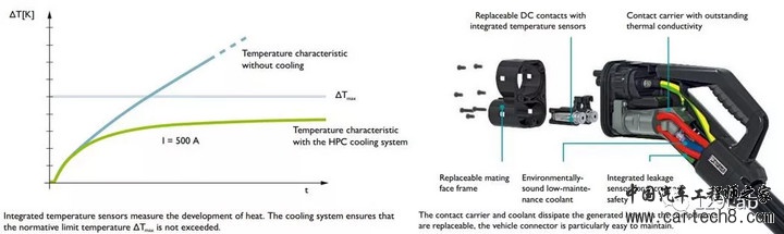 快充不仅仅是电池的问题,也是关系到充电设施的问题。这里简单说一下高功率快速充电(HPC,high power charging)的冷却问题。对于普通的充电枪,没有冷却系统,大电流高功率的充电很快会让温升超过上限∆Tmax,产生安全问题(下图左)。加入冷却系统后,即使500A的电流,充电枪的温升也可以控制在∆Tmax之下,提高了充电安全性,这需要对充电枪重新设计(下图右是PHOENIX带冷却的充电枪示例)。