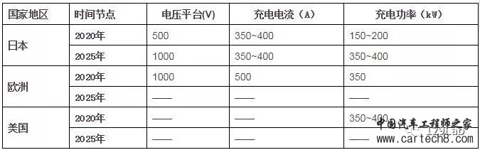 2月14日,中国电动汽车充电基础设施促进联盟(EVCIPA)官微发布了一份关于快速充电的专项调研报告,下图是从中选取的数据。日本对快速充相对谨慎,对充电功率大幅提高可能带来的风险更为关注,未来三年内计划将快充功率控制在150kW~200kW,到2025年才考虑规划到350kW。欧美由大型整车制造企业主导,在2020年将快速充电功率定义在350kW~400 kW,充电最大电流达到500A。