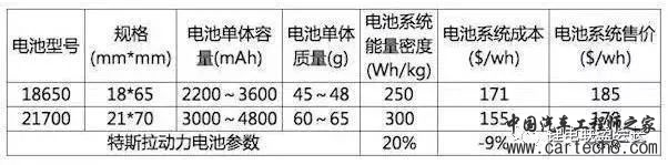 从特斯拉披露的21700电池信息看,21700相比18650能量密度提升20%,电池成本降低9%。电池单体电池容量的提升意味着同等能量下所需电芯的数量减少了,虽然虽然单个电芯的重量和成本提升了,但是电池系统PACK的重量和成本却得到了降低。