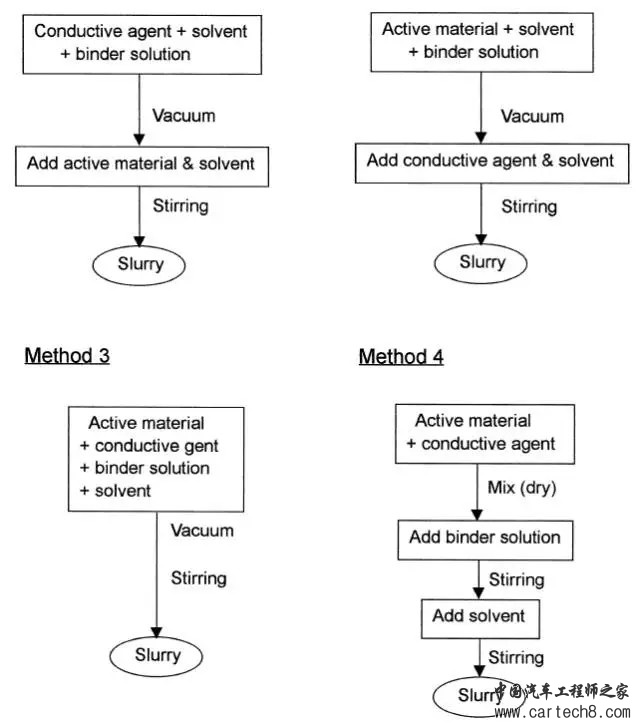 最开始锂电池浆料的制造借鉴涂料行业,1999年时,韩国人就开始了研究投料顺序对浆料性质和电池性能的影响。他们采取如图1所示四种投料工艺进行混料,采用相同的材料和配方,仅仅改变投料顺序就能改变浆料的性质。浆料的混合程度取决于颗粒大小,粒度分布,形状,比表面积,颗粒的溶剂吸收率等,从搅拌开始到粘度稳定所需的时间和依次加入的材料的比表面积最相关。
