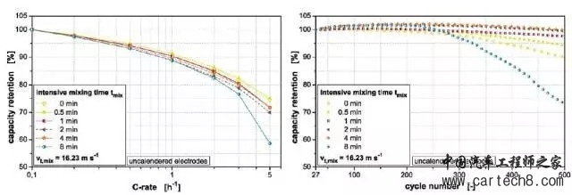 同样,高强度干粉分散混合,同样存在合适的工艺范围,在合适工艺范围内,极片和电池性能会提升,但是超出此范围,电池性能反而变差。