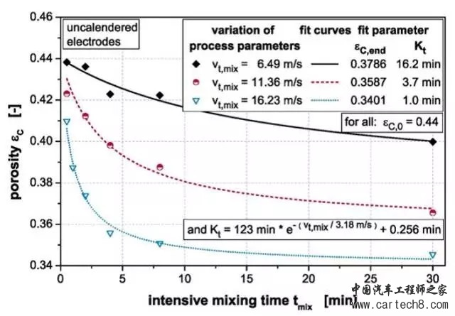 高强度的干粉分散混合主要的参数有:(1)高速分散的强度,可用弗鲁德数或转子线速度表示,(2)高速分散的时间。图6是高强度干粉混合对涂布极片孔隙率的影响,极片涂布之后未辊压,高强度干粉混合能够降低极片的孔隙率,转速一定时,随着分散时间越长,孔隙率越低,而分散时间一定时,转速越高孔隙率越低。