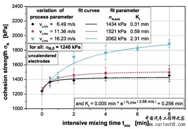 图7是高强度干粉混合对涂布极片结合强度的影响,极片涂布之后未辊压,高强度干粉混合能够提高极片的结合强度,转速一定时,随着分散时间越长,结合强度越高,而分散时间一定时,转速越高结合强度越高。