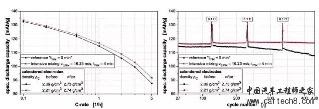 因此,采用高强度干粉混合工艺,必然能够提高电池的性能,如图8所示。极片涂布之后辊压到相同的涂层压实密度,然后同样的负极极片组装成全电池,测试电池性能。与不采用此工艺的电池相比,高强度干粉混合工艺可以提高电池的倍率特性和和循环性能。