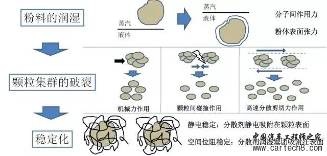 固体粉料在液体中分散基本过程如图3所示,分为:(1)粉料的润湿,将附着于粉体上的空气以液体介质取代。一种粉体要分散在液体中,首先必须被润湿,固体表面的湿润性由其化学组成和微观结构决定。固体表面自由能越大,越容易被液体湿润;反之亦然,润湿性可用接触角大小表示。(2)颗粒团聚体的破裂、分散,破碎团聚体主要有三种力:设备转动过程中的机械力,颗粒之间发生碰撞产生的作用力,高速分散剪切力。(3)固体悬浮物的稳定化,阻止已经分散的颗粒发生在团聚,分散稳定作用有静电稳定、空间位阻稳定。