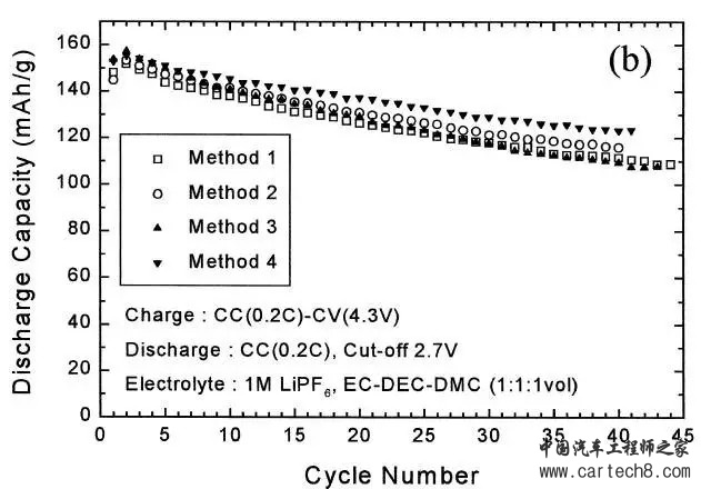 研究结果发现采用第4种工艺的浆料粘度达到稳定的时间可接受,而且所制备的浆料粘度最低,如表1所示,分散性最好,而且半电池循环测试结果表明此工艺制备的电池循放电容量衰减最小(图2所示)。