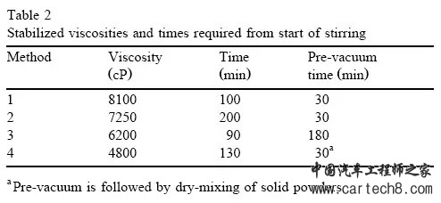 表1 四种混料方法浆料的稳定粘度和从开始搅拌到稳定所需时间