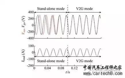 由下图V2G运行模式和独立运行模式相互切换过程的实验波形可以看出,采用本文所提双环无缝切换方案可以实现稳定和平滑的电压过渡,为一体化电站的稳定运行提供保障。