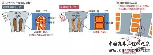 为了使定子小型化,线圈使用截面积大的方形导线(a)。与传统的圆形线圈相比,方形导线可使占积率从48%增加到60%。但是,由于和圆线相比方线变粗,导体(铜)中的“过电流损失”会增大。通常通过增大定子的槽宽度或减小每个线圈的厚度来减小过电流损耗(b)。