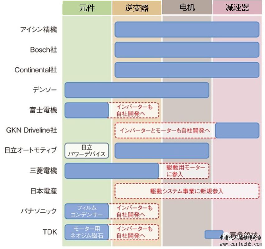 由于大部分汽车厂商都自己生产驱动系统相关产品,所以目前没有市场份额相当大的厂家存在,包括大型零部件供应商在内的行业新加入者,几乎都处于同一起跑线上。因此,各家之前专攻电机、电频器、或减速机的厂家,都加入到了新产品开发与生产体制强化的运动中,以此迎接竞争。