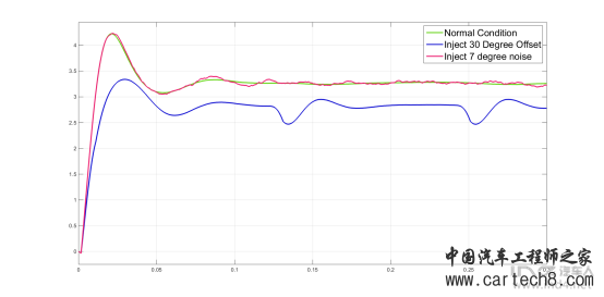 这个位置信号到底有多重要呢?还是用数据来说话吧。笔者搭建了一个电机的电流环仿真模型,固定电机转速的情况下,给定电机3.2Nm的控制指令,分三种工况进行仿真:
