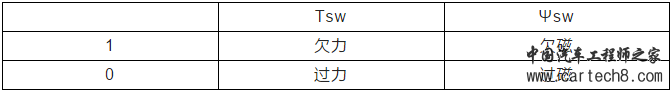 计算得到定子磁通和扭矩值以后,与其参考值做比较并经过滞缓比较器以后,得到两个非零即1的状态量,表征当前磁和力与参考值的关系其关系如下。