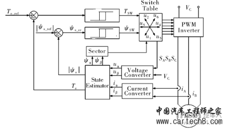 DTC的出现比FOC晚了十多年,是上世纪80年代中期由德国学者Depenbrock教授提出。其基本思路是不再将定子侧的相关变量折算到转子的旋转坐标系下,放弃了矢量控制中电流解耦的控制思想 ,去掉了PI调节模块、反Clark-Park变换和SVPWM模块 ,转而通过检测母线电压和定子电流 ,直接计算出电机的磁链和转矩 ,并利用两个滞环比较器直接实现对定子磁链和转矩的解耦控制。