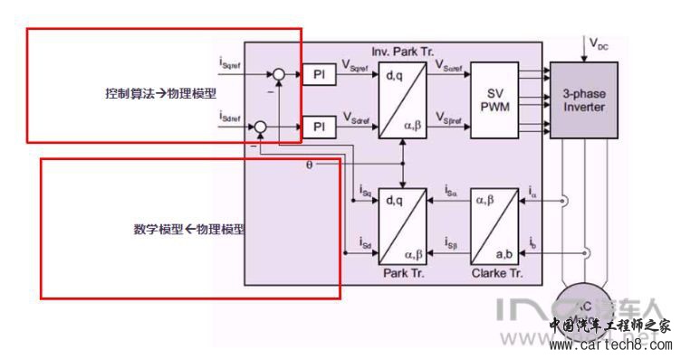 FOC的控制的基本思路就是将三相静止ABC坐标系下的相关变量转换到旋转坐标系下(d,q)进行数学运算,controller改变d轴和q轴的电压达到控制d轴和q轴电流的目的。然而最终给电机三相的只能是静止坐标系下的电压,因此在控制算法中需要再次把dq轴的电压转换成ABC三相电压给驱动桥。即存在一个从物理模型à数学模型à控制算法à物理模型的过程。