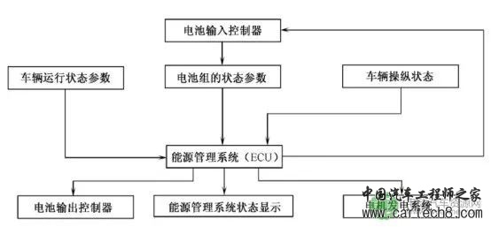 输入能源管理系统电控单元ECU的参数有各电池组的状态参数(如工作电压、放电电流和电池温度等)、车辆运行状态参数(如行驶速度、电动机功率等)和车辆操纵状态(如制动、启动、加速和减速等)等。能源管理系统具有对检测的状态参数进行实时显示的功能。ECU对检测的状态参数按预定的算法进行推理与计算,并向电池、电动机等发出合适的控制和显示指令等,实现电池能量的优化管理与控制。
