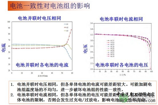 据介绍,当将三支具有差异的电池并联时,容易在充电后期产生较大的差异,充电前期电流小的电池,后期电流就会突然增加;充电前期电流大的电池,后期电流就会减少。这就是不一致性导致的结果。在电池串联的情况下,各单体电池的电压可能差距较大,需要进行单体电池的电压限制,否则会发生有些电池已经过放过充了,有些还没有达到相对应的状态,从而影响电池安全性和寿命,这也是不一致性所导致的。