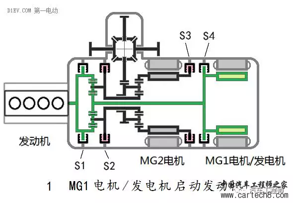 放开S1、S4,锁止S2,S3,使得第一级行星轮系中的星轮架与第二级行星轮系中的太阳轮相联接的传动轴固定不转动,开启MG1电机/发电机,太阳轮齿轮转动传送行星轮齿轮,行星轮齿轮带动齿圈至发动机启动,发动机转动之后MG1电机/发电机可以发电,对电池组进行充电,发动机可设定在最佳转速、最佳扭矩和最佳油耗状态下工作。