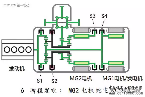 按第一项启动发动机后,MG2电机从静止不断提高转速,汽车开始加速。S3是保持锁止状态,即两组行星轮系动力相隔开,MG1电机/发电机发电与MG2电机驱动互不干扰,启动、停止、速度的快慢,整个行驶过程由MG2电机驱动,中高速时使用回馈制动由MG2电机回收,向电池组充电,并将其暂时贮存起来供加速时再用。通过控制系统优化,可以让发动机一直工作在最佳转速,即使在充电不便时,市内堵车路况下油耗也比较低,也可以控制发动机噪音到非常小。在增程模式下,没有"里程焦虑",而且发动机可以一直控制在最佳转速,油耗低,噪音小,振动小便能使发动机一直保持在最佳工况状态,动力性好,排放量很低。而且电能的来源都是发动机,只需加油即可。