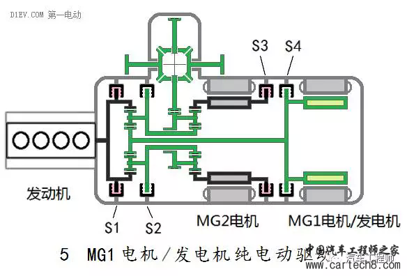 按第一项启动发动机后,S1、S2、S4全放开,继续锁止S3,使得第一级行星轮系中的星轮架与第二级行星轮系中的太阳轮相联接的传动轴固定不转动,切断两级行星轮系的关联,使各自运转。在MG1电机/发电机反转速度与发电时的速度一致,在发动机保持发电的转速,将MG1电机/发电机反转速度逐渐降低至零随即正向转动,同时,MG2电机也从静止不断提高转速(放开S3),汽车开始加速。在整个过程,通过MG1电机和MG2电机分别呈相反方向旋转来驱动车辆起步,双电机与发动机同步急加速的时候,电动机和发动机可以一起驱动车轮,实现最大动力输出。MG1电机/发电机配置功率比MG2电机功率小,而两电各自有合适的传动比,再加上两种耦合的叠加传动比,即可有多个挡位使用,毎个挡位都能功率与速度的对应,各电机在高效区转速范围内使用,物尽其用,能量回收尽可能在高效区,续航里程大幅提高。在此模式中双电机和发动机可共同参与加速、加速度也是最大,加速时间最短,超加速能力最强,同时可达至最高速。随外界的负荷变化,让电动机的驱动力与行驶阻力始终保持平衡,从而在高效率区工作。动力系统更加灵活地根据工况来调节内燃机的功率输出和电机的运转。全功能混合动力技术还是目前最新的混动技术,可靠性也更高。电控系统通过扭矩传感实时探测车辆行驶的工况,来判断发动机是否需要参与驱动,从而决定是采用纯电驱动、混合驱动还是发动机直驱的模式来精细化管理能耗,并且不受车辆行驶速度的限制,又能在高速状态下,对经济性带来更大的提升,同时也能获得更加出色的加速性能。从而更有效地利用发动机高效工况,达到更省油的目的。是一种比较完美的组合。