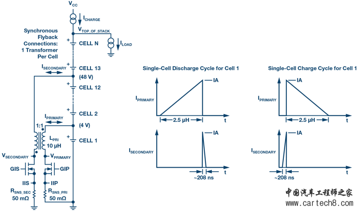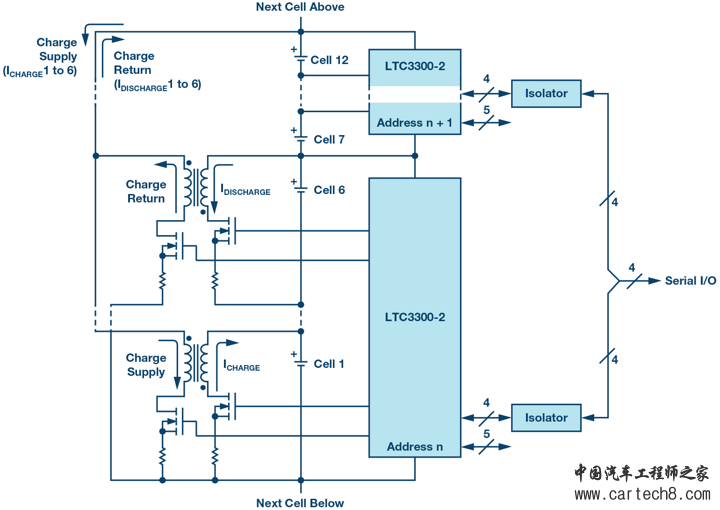 LTC3300-2(见图4)是专为满足高性能主动均衡需求而设计的新产品。高效率、双向、主动均衡控制IC LTC3300-2是高性能BMS系统的关键组成部分。每个IC可以同时均衡多达6个串联连接的锂离子或磷酸铁锂电池单元。
