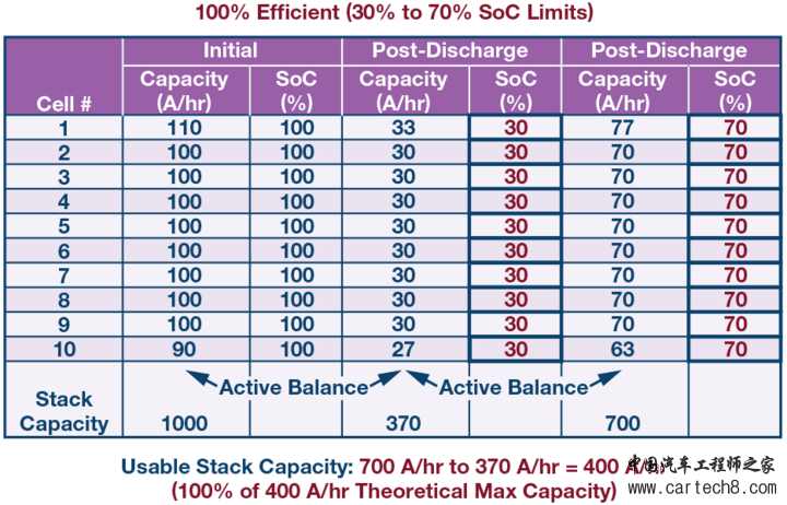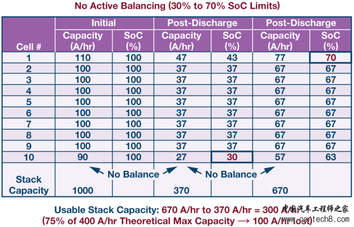 电池单元间的容量或SoC不匹配可能会严重降低电池包可用容量,除非均衡电池单元。为使电池包容量最大化,要求在电池包充电和放电期间,电池单元是均衡的。在图2所示的例子中,一个10单元串联电池包由(标称)100 安时电池单元组成,最小容量单元与最大容量单元的容量误差为±10%,对该电池包充电和放电,直至达到预定SoC限值。如果SoC值限制在30%和70%之间,并且不进行均衡,则经过一次完全充电/放电循环之后,电池包可用容量相对于理论可用容量减少25%。被动均衡理论上可以在电池包充电阶段均衡各电池单元的SoC,但在放电期间,无法阻止第10个单元先于其他单元达到30%的SoC水平。即使在电池包充电期间进行被动均衡,在电池包放电期间也会损失可观的容量(不可用)。只有主动均衡解决方案才能恢复容量,在电池包放电期间将电荷从高SoC单元重新分配给低SoC单元。