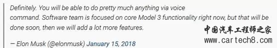 语音指令功能也是几天前一位车主的在推特上问到的。马斯克问答道:“几乎所有的功能都可以通过语音指令实现。软件部门目前的重心在于 Model 3 的核心功能,目前快要完工了,随后我们将会增加更多的功能。”