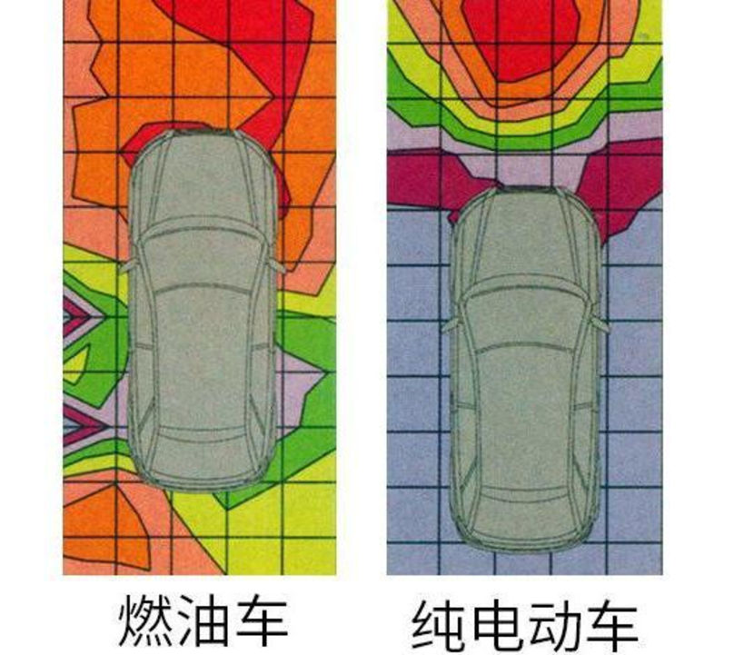 还有人会担心,电动汽车都开始发出这样的“噪声”会不会影响我们的日常生活。传统燃油车噪音集中在前方的发动机红色、橘色部位,在车尾排气部位差生了橘色程度噪音,而对于电动车,则可以非常有效地控制声音发射方向,车头正前方远处以及附近两侧为深红色,完全就为了让前方的人能够感知到车辆的存在,而不会影响其他人。