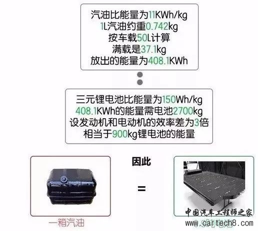 能量密度方面电池肯定不如汽油,但是究竟差别多大呢?一箱50L的汽油可以大概跑600km,续航同样里程的电动车需要多少电池呢?(如下图)