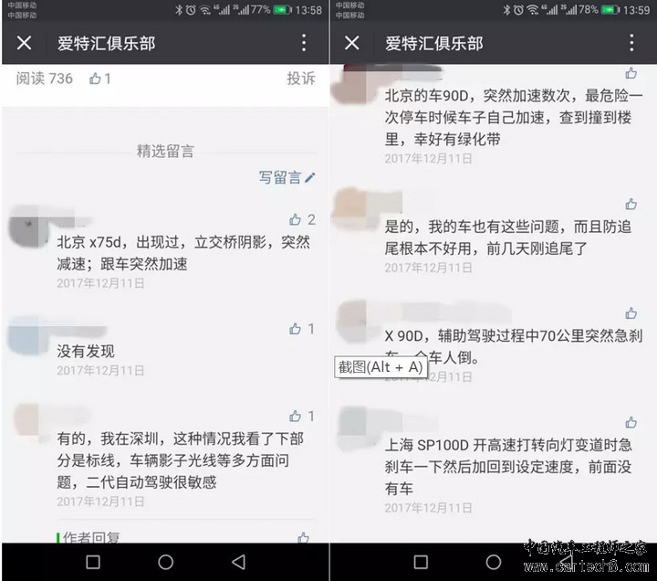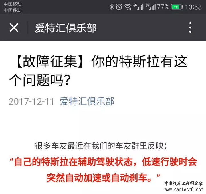 以特斯拉车主为目标用户的自媒体“爱特汇俱乐部”曾发起过一个话题,不知你的车是否也有这个问题(自动驾驶、无法识别静态障碍物等)?