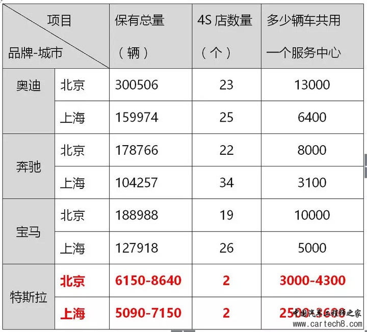 比较后发现,以现有的车辆保有量来说,特斯拉的官方服务中心并不能算“太少”。