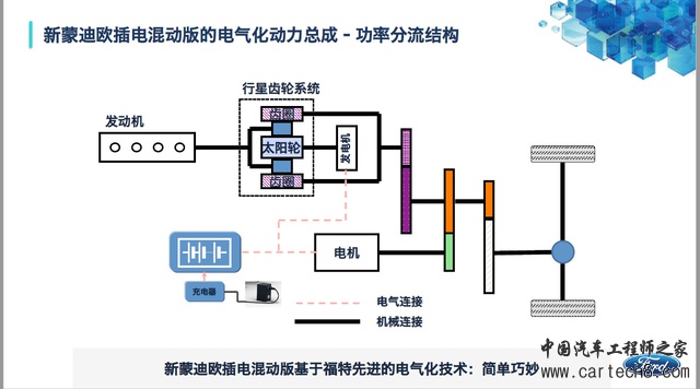 而新蒙迪欧采用的插电式混动系统结构,则是目前技术和理念非常先进的双电机混联式结构:由内燃机、两台电机以及行星齿轮动力分流结构组成的混联式系统可以令内燃机最大程度运转在高效区间内,这样一来即便是电力耗尽之后,车辆的油耗仍然非常低。