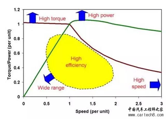 上面这个图就是电动机的外特性曲线,其中红色线是扭矩输出特性,绿色线是功率输出特性,而黄色的部分就是电动机运行比较高效的区间。