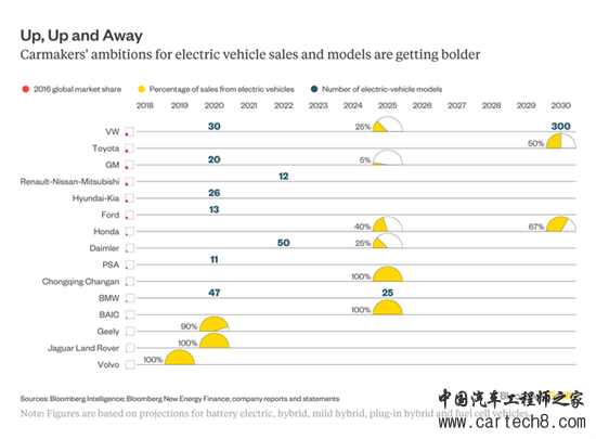 新能源汽车市场的变化不只发生在中国。戴姆勒表示,到2025年,将会有四分之一的汽车为电动车。本田则计划到2030年,公司将新能源车占全系列汽车的比例调高至三分之二。
