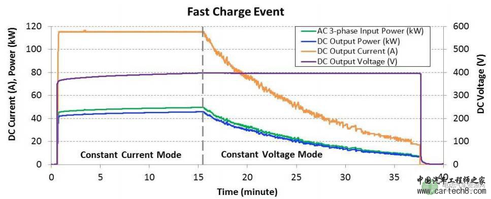 影响BEV普及的因素,除了动力电池的价格,另外一个因素之一是充电时间。直流快充是减少充电时间的重要手段,例如50kW或120kW的直流充电桩,可以在一定程度上缓减里程焦虑。下图是采用ABB50kW DCFC给2015Nissan Leaf BEV充电的曲线图,典型的CCCV充电模式,电池总能量是24kWh,最高DC电流在115A-120A之间,持续时间15min多一点,随后切换到CV模式,继续充电20+min,整个过程耗时不到40min,比Level1&2的几个小时充电时间要快很多。