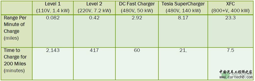 2016年的时候,宝马、戴姆勒、福特、大众、奥迪、保时捷签署了谅解备忘录,在欧洲合作建设BEV的350kW高功率直流充电网络,大概在400个左右的超快充电站点,采用的是CCS标准。与此同时,为了能够实现与燃油车真正进行竞争,DOE也开展了关于更快速充电的研究,功率高达400kW,或者成为ExtremeFast Charge (XFC)。下图简化对比了几种充电方式(假设电能消耗为0.3kWh/mile,忽略充电效率)。XFC的提出目标是实现<10min的充电时间,同时整个电压一下子提高到800V左右,远高于现行的300-400V左右的高压储能系统,这对于电池设计又是一个挑战。