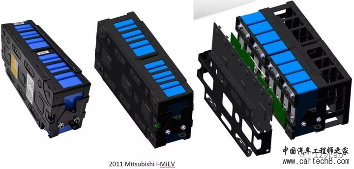 下图是三菱的2011款i-MiEV电池模块,还是采用的PCB板采集cell的电压、温度,两端通过螺栓紧固。cell之间是最常见的busbar和螺栓连接方式。
