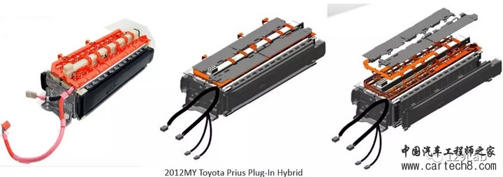 接下来是2012款丰田普瑞斯PHEV的电池模块,采用线束(现在来看这种线束的采集方式,感觉在有些场合下是十分麻烦的,存在隐患)来采集cell信息,也是采用螺栓的连接方式,不过增加了橙色的部分进行保护。
