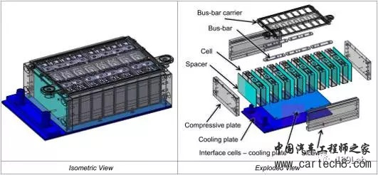下图是奥迪2014年的一个PHEV的模块设计概念图,匹配液冷板的设计,从图可以看到上面看不到的一些内部结构。