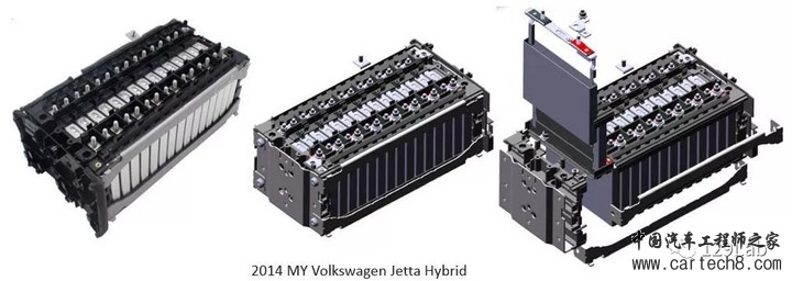下面是2014款大众捷达HEV的电池模块,通过侧面的两根压条来紧固模块,端板外侧加上塑料盖板进行绝缘。