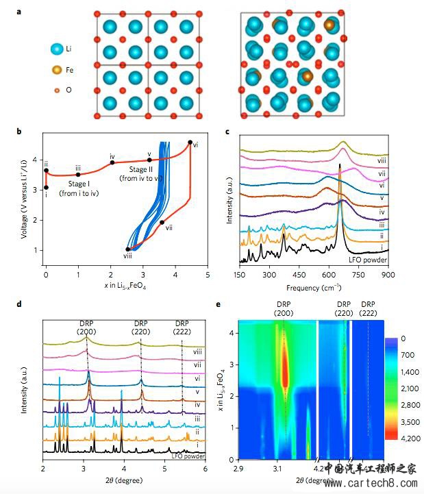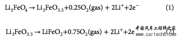 Li5FeO4材料在充电过程中的物相变化如下图所示,当将充电电压控制在3.8V时,充电过程中部分Fe3+和O2-被可逆的氧化为Fe4+和O-,进一步充电时,O-就会被进一步氧化为O0,从而产生O2,造成容量的不可逆损失。