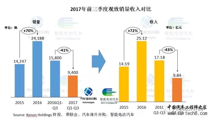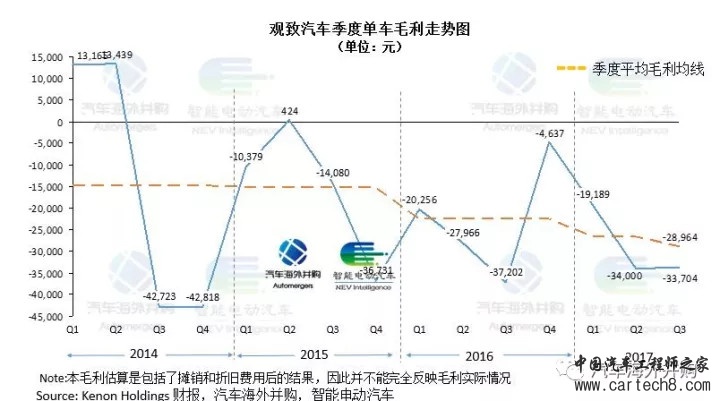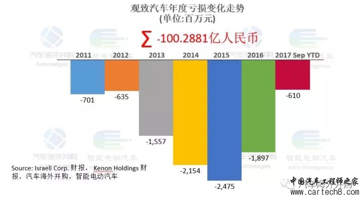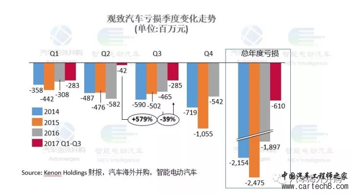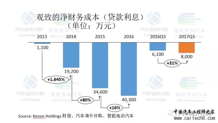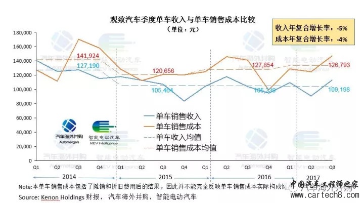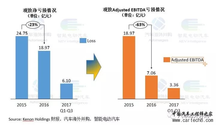 如果用调整的EBITDA测算,2015年观致总亏损25亿,除去前几年借贷造成的净财务成本、贬值以及无形资产摊销等的8个亿,调整的EBITDA总亏损应该在16.6亿左右,而2016年总亏损19个亿,除去前几年因高额借贷造成的净财务成本、贬值以及无形资产摊销等的11个亿,2016年观致调整的EBITDA总亏损应该是7个亿。同样,2017年前三季度总亏损6.1亿,剔除净财务成本、贬值以及无形资产摊销等因素,调整的EBITDA则从亏6.1个亿的亏损变成了亏3.36个亿,亏损幅度收窄了45%。