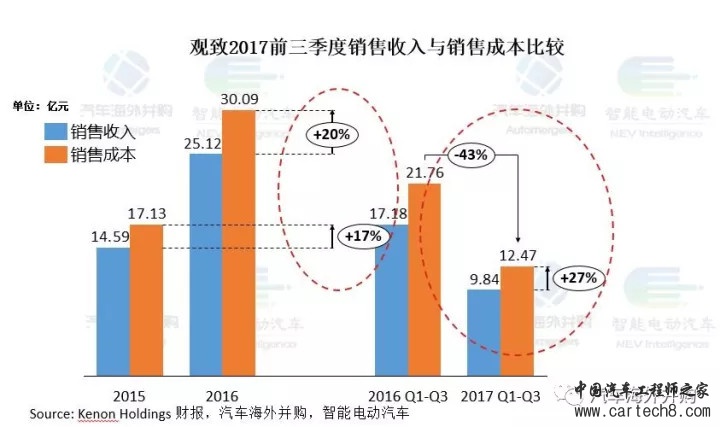 财报显示,2017年前9个月,观致的销售收入因受到销量大幅下滑的影响而出现了43%的同比下跌,而同期销售成本也出现了差不多43%的同比下滑。从销售收入与销售成本对比中可以看出,2015年销售成本与销售收入之间相差17%,到2016年这个差距增加到了20%,而到了2017年三季度销售成本与销售收入之间差别增加到了27%。在过去的近三年的时间,观致的销售成本始终高于销售收入,这样的商业运作不亏损基本是不可能的,并且还有不断扩大的趋势。