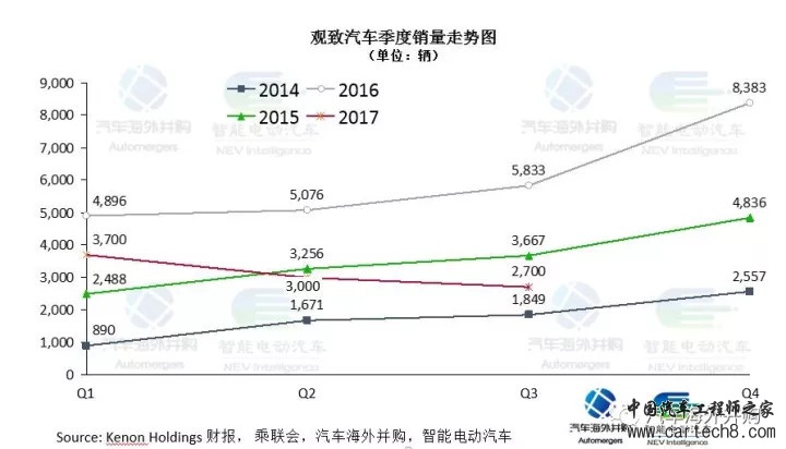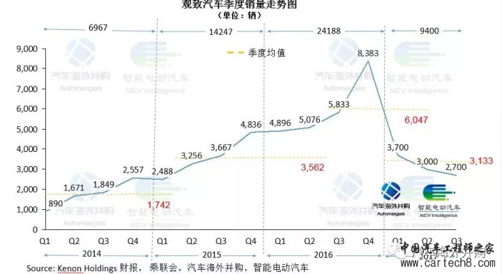 从季度同比和环比来看,2017年三季度比去年同期和2017年二季度均出现了26%和10%的下滑,如果没记错的话,这应该是观致自二季度以来再次出现同比环比全下滑的情况。