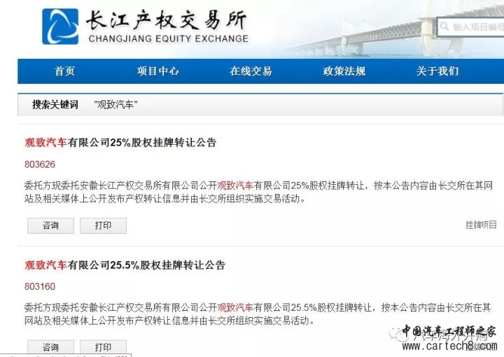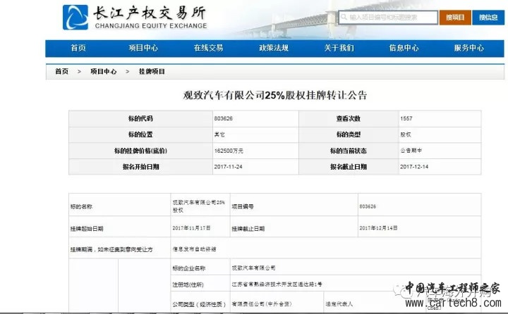 11月17日,负责安徽省国有企业产权交易的安徽长江产权交易所再次发布观致汽车的25%股权挂牌转让公告,芜湖奇瑞汽车投资有限公司预以16.25亿元人民币的标的价格转让其持有的50%观致汽车股权中的25%。报名截止日期是12月14日。