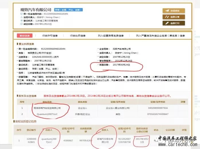 《汽车海外并购》与《智能电动汽车》从国家企业信用信息系统查询后发现,截止到2017年12月21日,观致汽车有限公司的工商登记还没有发生变更,两大股东仍为芜湖奇瑞汽车投资有限公司(50%)和Quantum(2007)LLC(50%)。根据《安徽长江产权交易所观致汽车的25%股权挂牌转让公告》,“宝能需要在工商登记变更完成后五个工作日内向观致汽车向观致打款不少于人民币15亿元”。