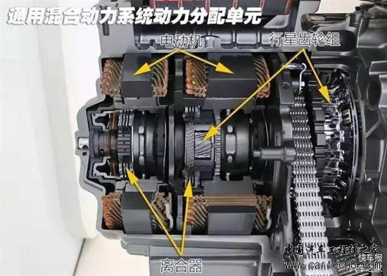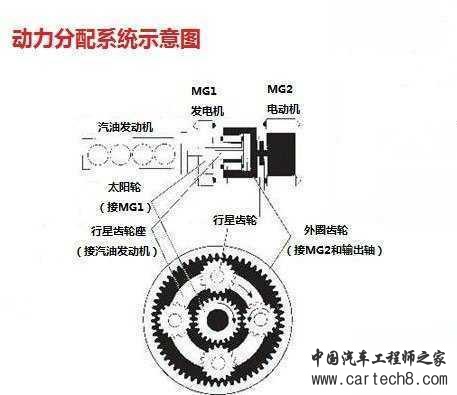 这套系统是由2个电机和1套行星齿轮组成的,通过连续的电控调速来实现变速,上图的MG1电机和MG2电机,分别是用来调速和驱动电机的,然后通过这套行星齿轮与发动机相连进行变速,当MG1电机的转速达到一定范围,车速高于一定值的时候,发动机就会启动。