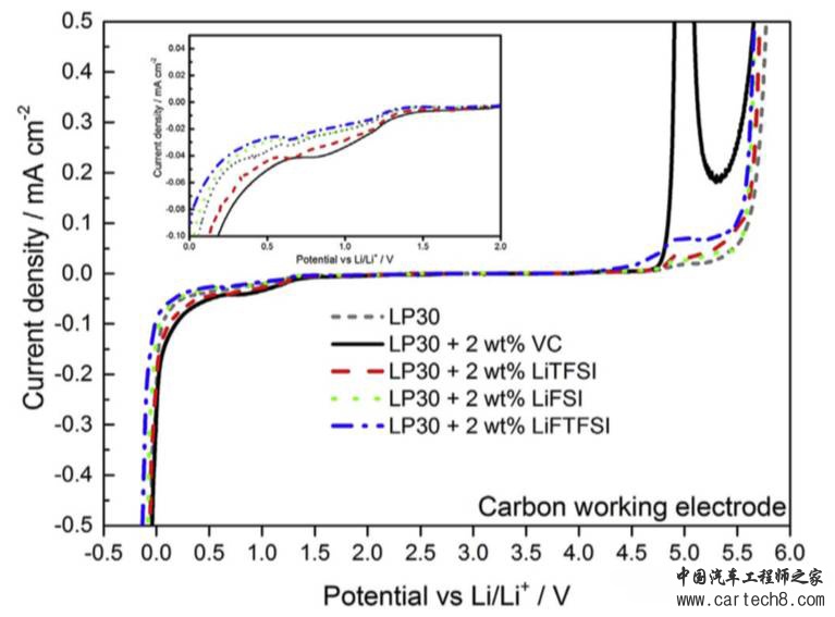 为了克服这些问题,人们曾寄希望于对H2O更加稳定,并且具有更好的热稳定和化学稳定性的酰亚胺类锂盐,例如LiTFSI、LiFSI和LiFTFSI等锂盐,但是受到成本因素的限制,以及无法解决LiTFSI等锂盐的阴离子对Al箔的腐蚀等问题,LiTFSI锂盐一直没有在实际中应用。近日,德国HIU实验室的Varvara Sharova等为酰亚胺类锂盐的应用找到了新的出路——作为电解液添加剂。